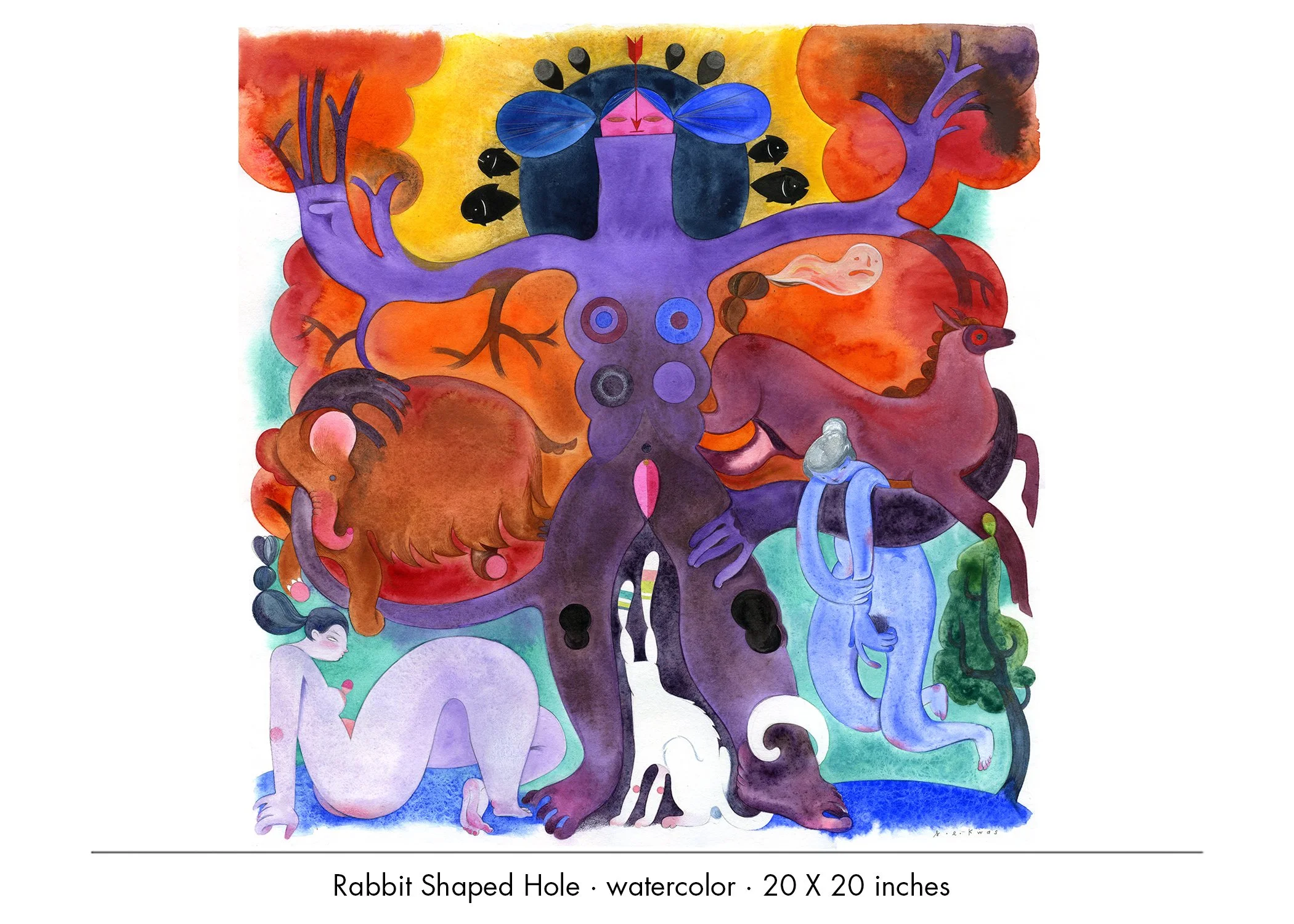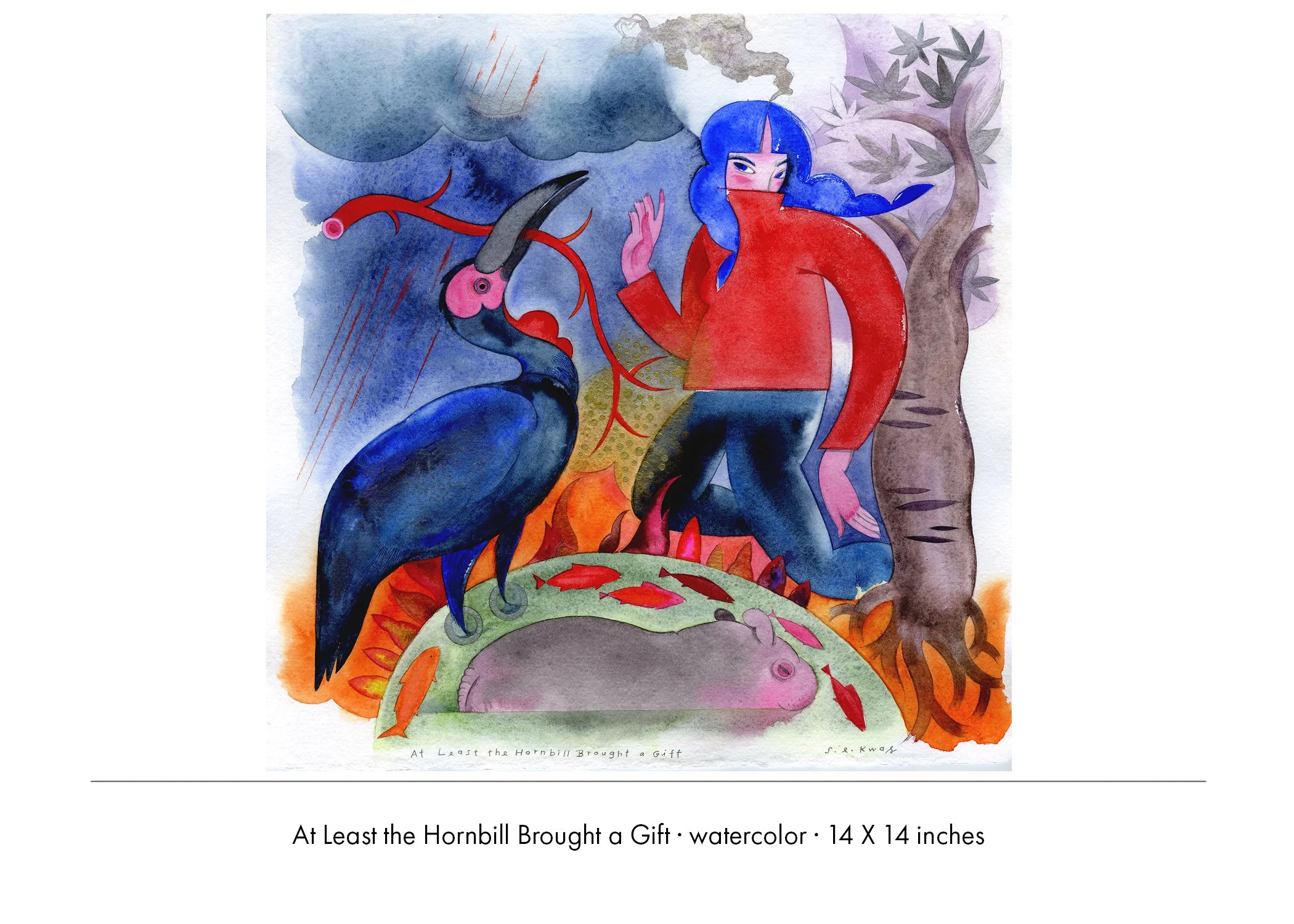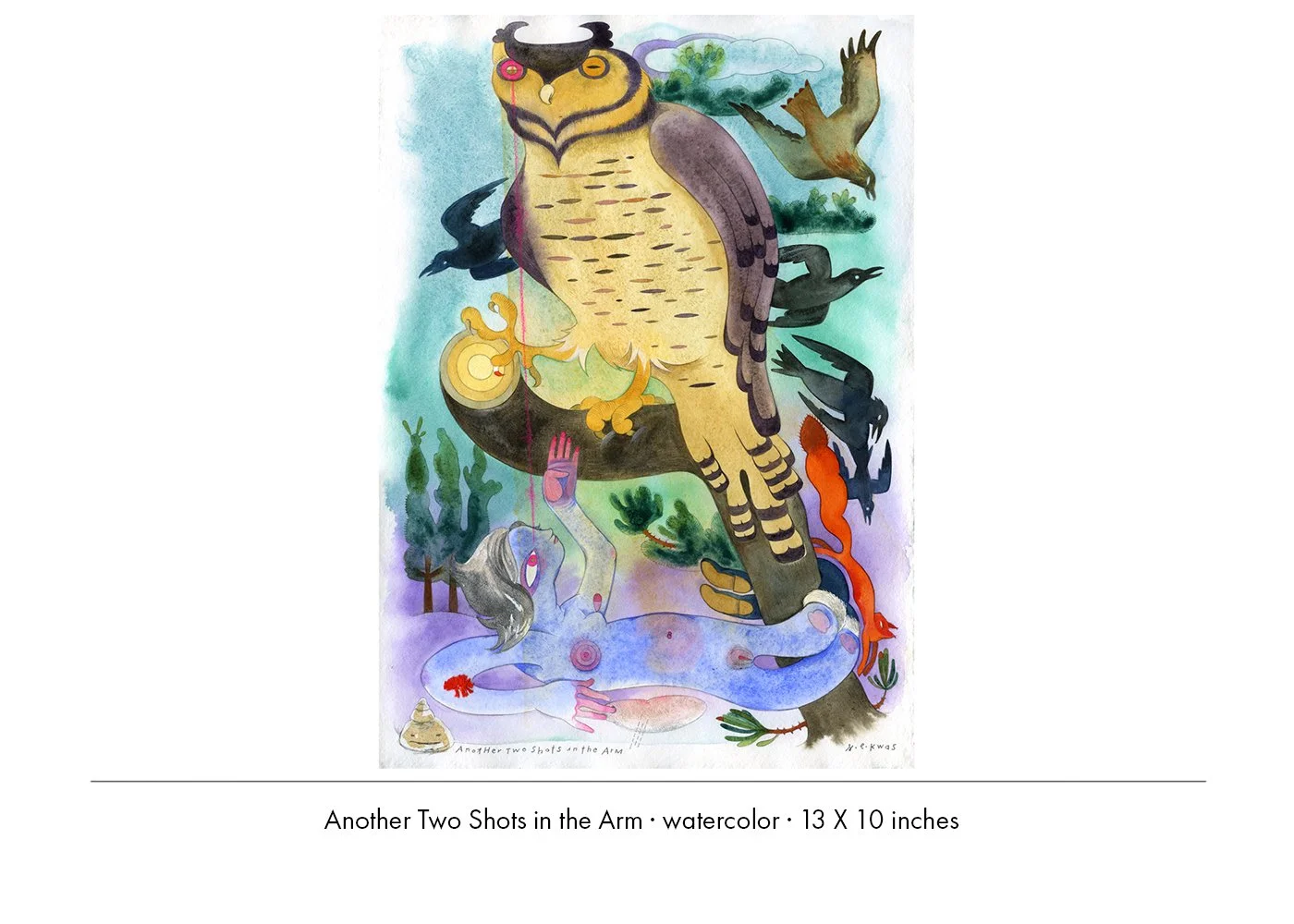 These watercolors are 100% self expression. Often observational, the images get layered with things happening in my life or in the world. I use animal and human imagery interchangeably or sometimes I combine attributes of both. I return to themes of concern for the natural world and the rapid pace in which the world is turning away from the sensual to the digital. For me, the magic happens in the sliver of a Venn diagram where my life and the experiences and imagination of the viewer intersect and a third, wonderful meaning is born.